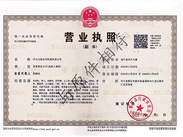 關(guān)于我們 購(gòu) !   河北力揚(yáng)水利機(jī)械有限公司,成立于2016年,地址河北省邢臺(tái)市新河縣富強(qiáng)街與九龍北路交匯處西南角具備生產(chǎn)及供應(yīng)、安裝能力。我們公司位于董振堂將軍故里,河北省邢臺(tái)市新河縣九龍工業(yè)區(qū),是一家集設(shè)計(jì)、生產(chǎn)、銷售、安裝、售后一體的綜合性水利機(jī)械廠家,現(xiàn)有人員共40余名,獲有國(guó)家頒發(fā)的全國(guó)工業(yè)產(chǎn)品生產(chǎn)許可證、ISO質(zhì)量管理體系認(rèn)證、環(huán)境體系認(rèn)證、職業(yè)健康體系認(rèn)證并且我公司通過水利相關(guān)部門水工金屬結(jié)構(gòu)質(zhì)量檢驗(yàn)中心的考核和監(jiān)督下獲得了:認(rèn)證頒發(fā)的四項(xiàng)產(chǎn)品認(rèn)證證書(平面閘門、弧形閘門、回轉(zhuǎn)式清污機(jī)、耙斗式清污 ABOUT US